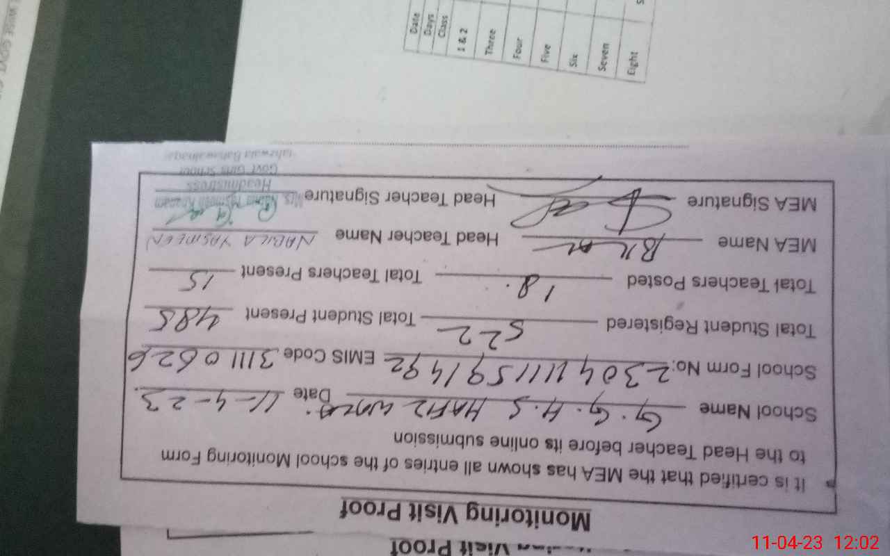 | Attendance Register | Head Teacher | MEA with School | Visit Proof |