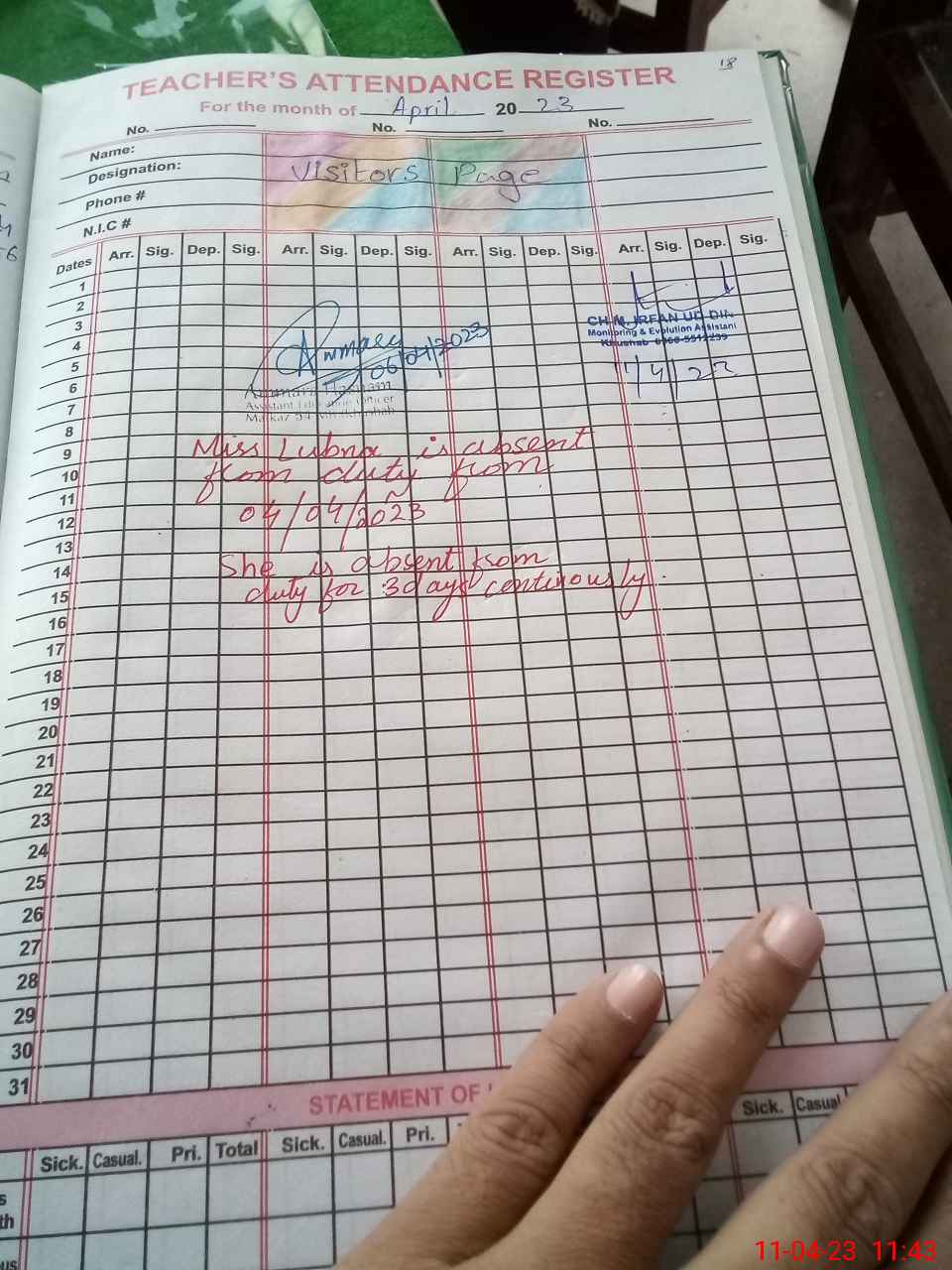 | CNIC | Full Name | Designation | R/C | Absence During Last Calender Month |