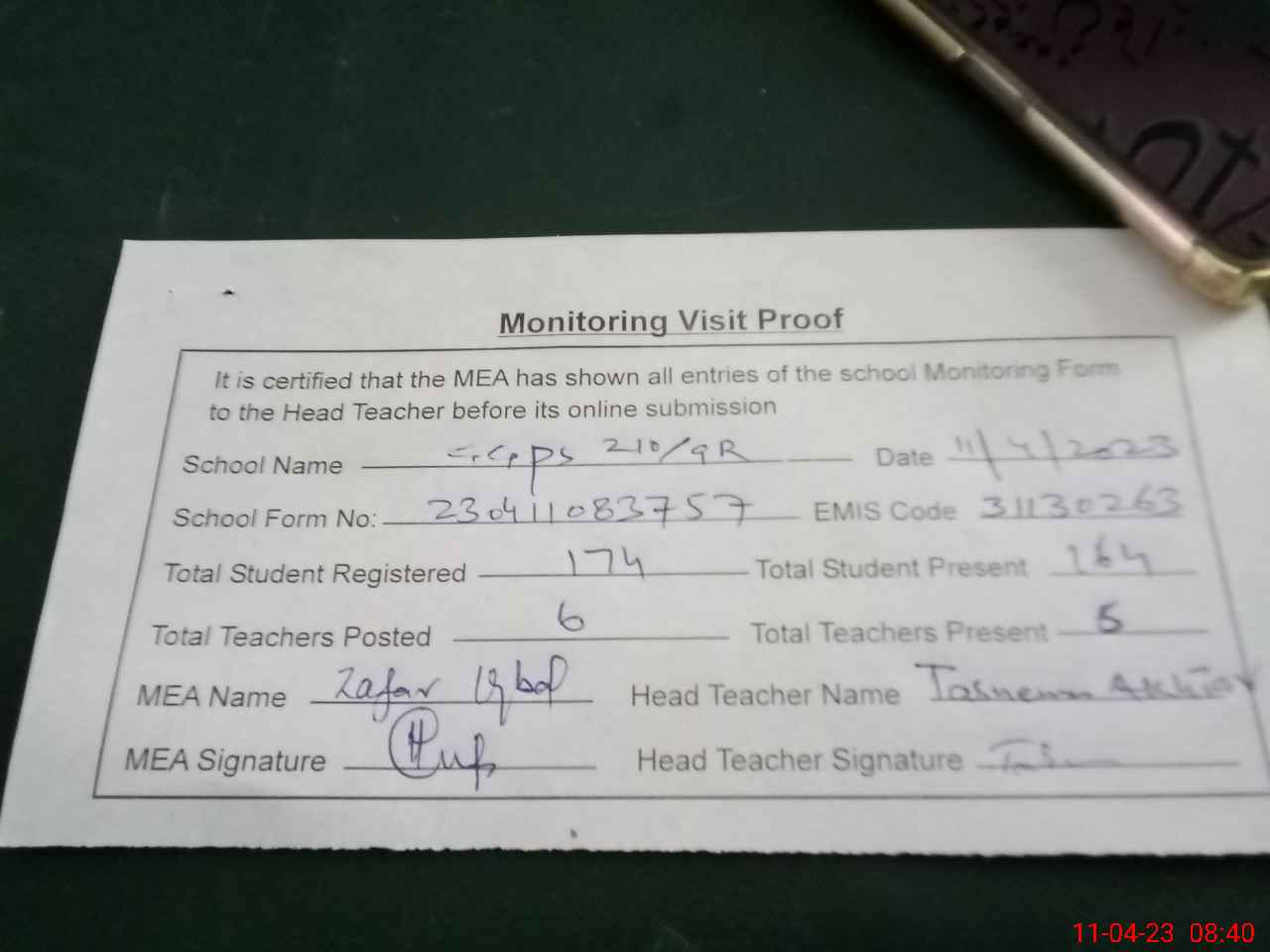 | Monitoring Date: 11-04-2023 | Start Time: 11-04-2023 08:23 AM | End Time: 11-04-2023 08:40 AM | Name of MEA: Za**** Iq**** BN**** | |