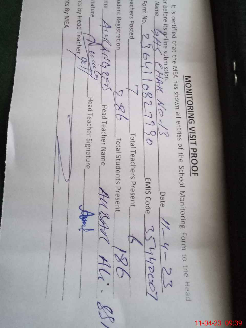 | Attendance Register | Head Teacher | MEA with School | Visit Proof |