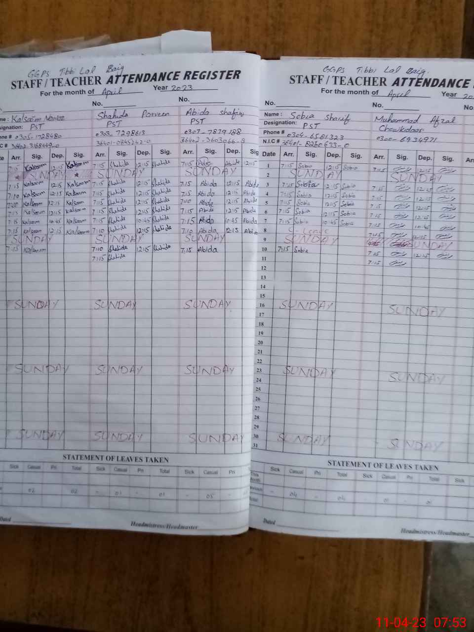 | CNIC | Full Name | Designation | R/C | Absence During Last Calender Month |
