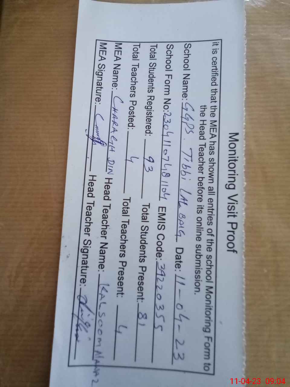 | Attendance Register | Head Teacher | MEA with School | Visit Proof |