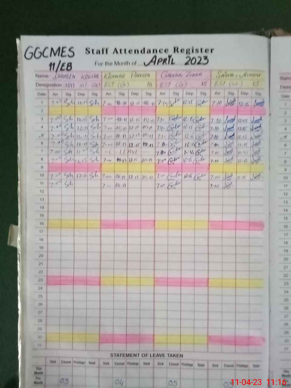| Monitoring Date: 11-04-2023 | Start Time: 11-04-2023 11:15 AM | End Time: 11-04-2023 12:12 AM | Name of MEA: Gh**** Mu**** Mu**** (R**** | |