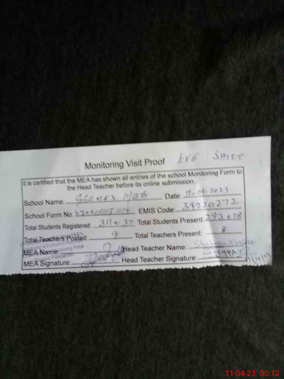 | Attendance Register | Head Teacher | MEA with School | Visit Proof |