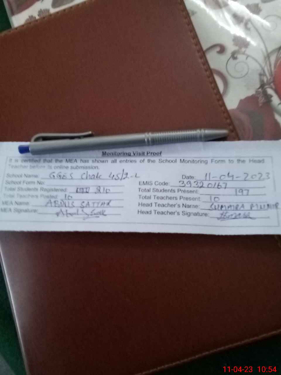 | Attendance Register | Head Teacher | MEA with School | Visit Proof |