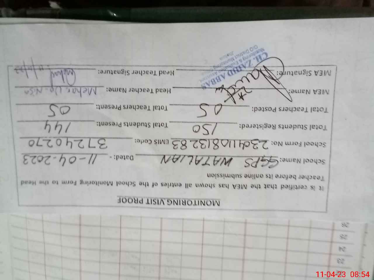 | Monitoring Date: 11-04-2023 | Start Time: 11-04-2023 08:13 AM | End Time: 11-04-2023 08:55 AM | Name of MEA: Za**** Ab**** | |