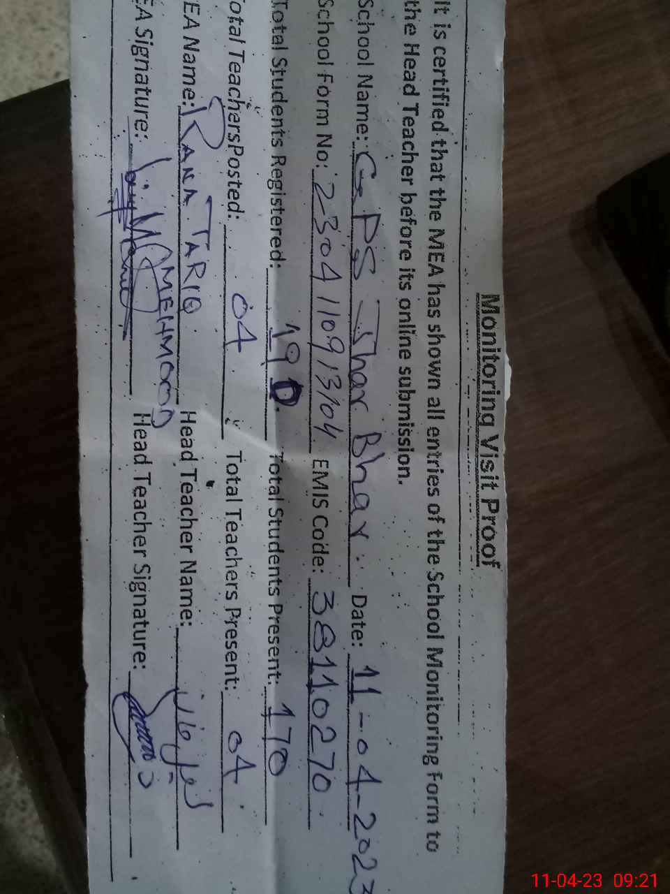 | Attendance Register | Head Teacher | MEA with School | Visit Proof |