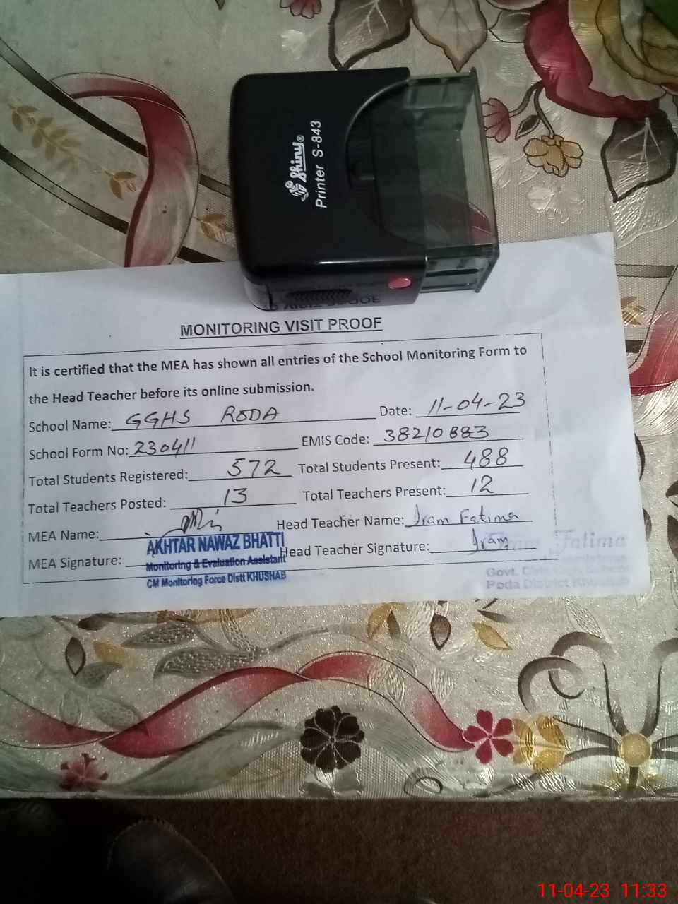 | Monitoring Date: 11-04-2023 | Start Time: 11-04-2023 11:09 AM | End Time: 11-04-2023 11:33 AM | Name of MEA: AK**** NA**** (R**** | |