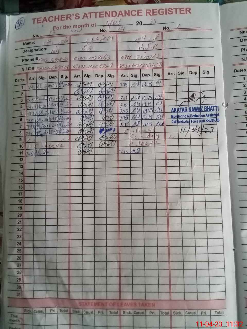 | CNIC | Full Name | Designation | R/C | Absence During Last Calender Month |