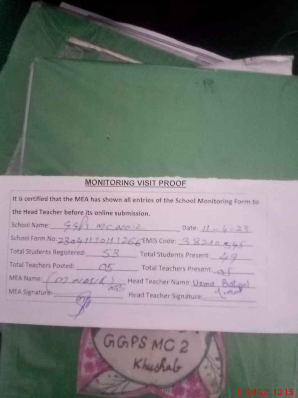 | Attendance Register | Head Teacher | MEA with School | Visit Proof |
