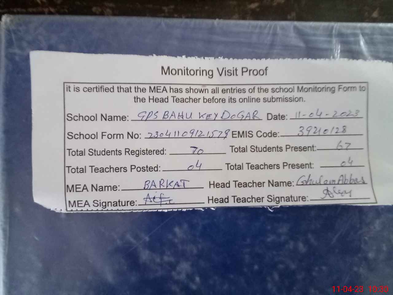| EMIS Code: 39210128 | Name of School: GPS BAHU KEY DOGAR | |||
