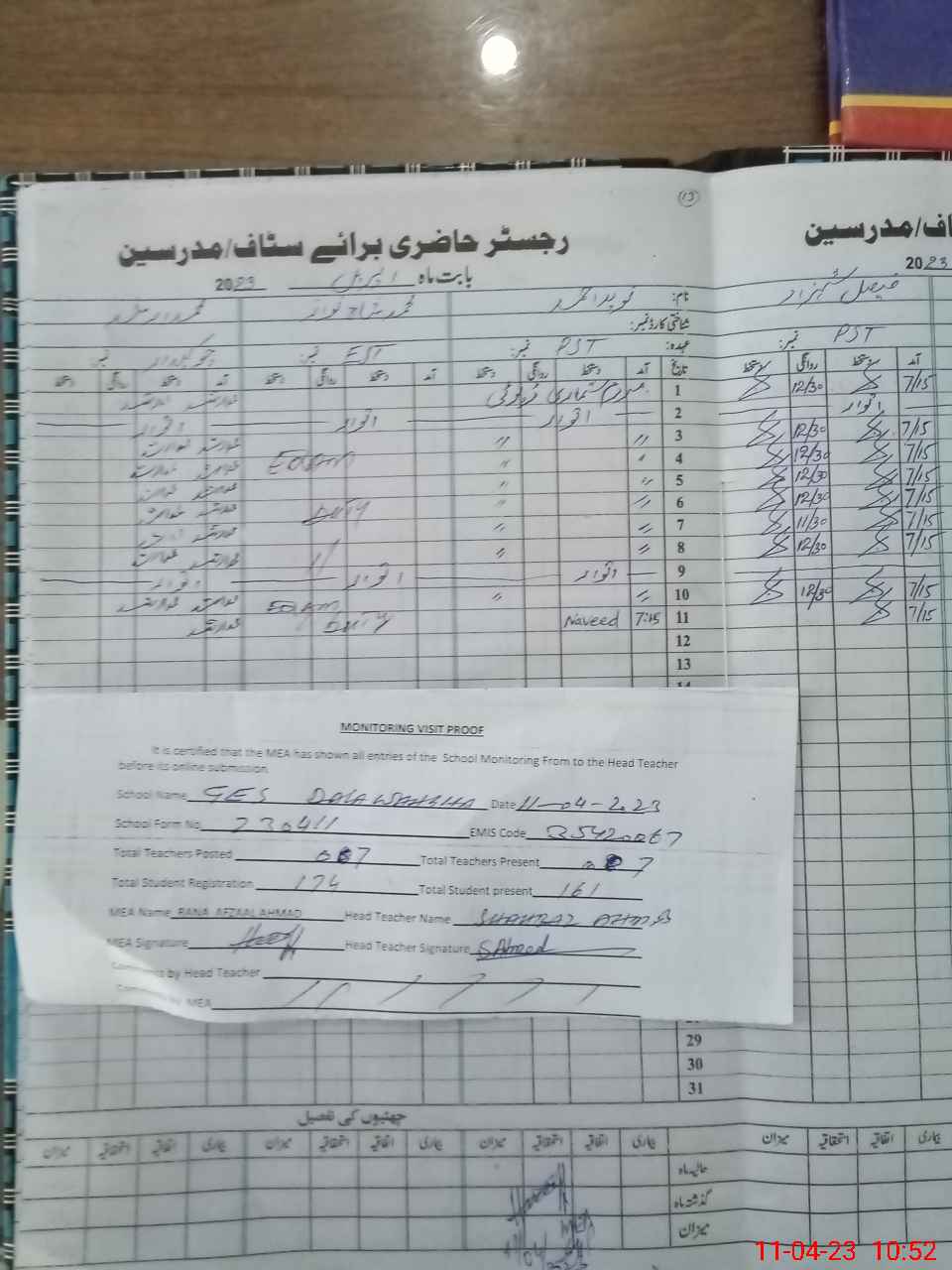 | Attendance Register | Head Teacher | MEA with School | Visit Proof |
