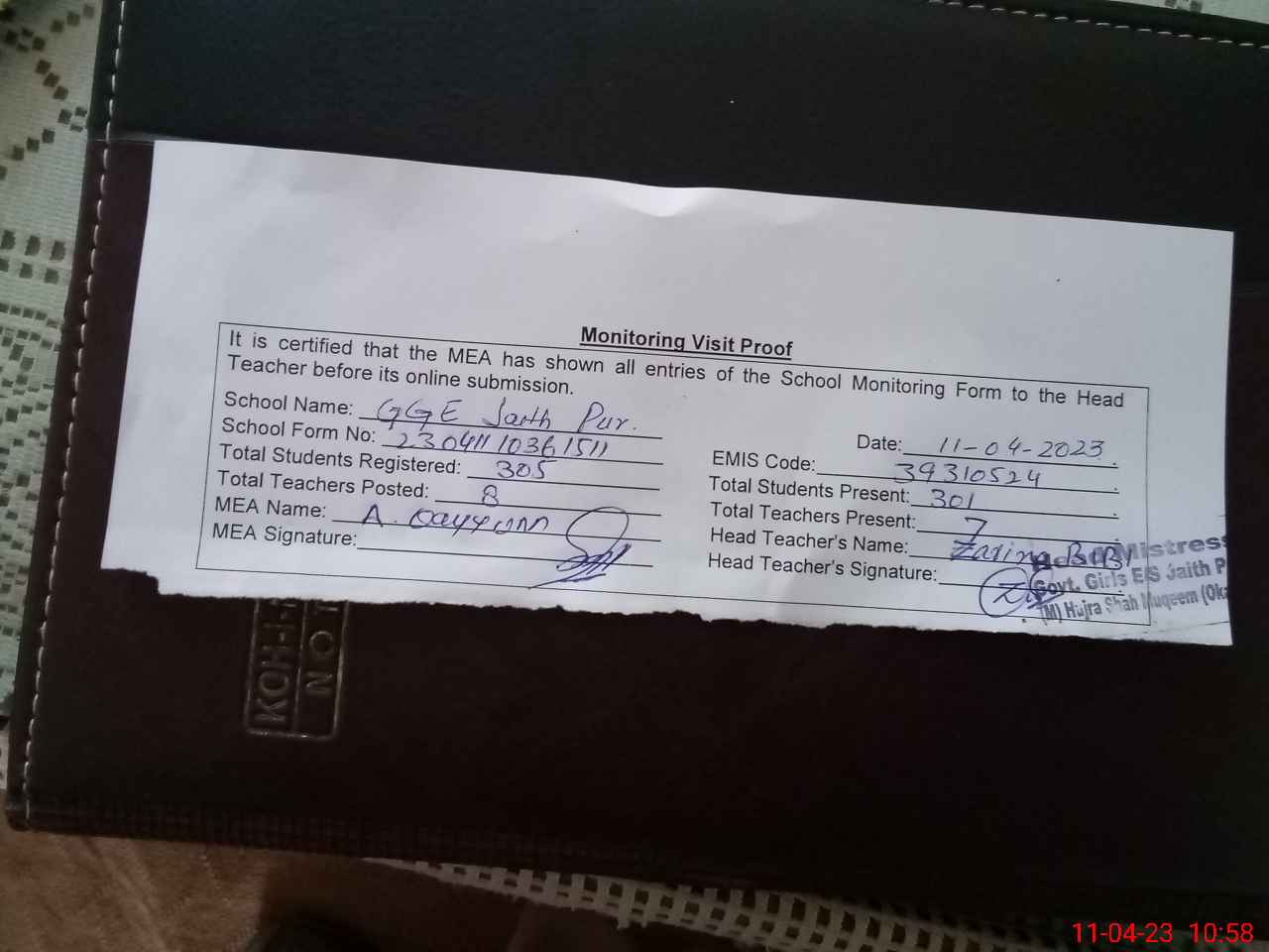 | Attendance Register | Head Teacher | MEA with School | Visit Proof |