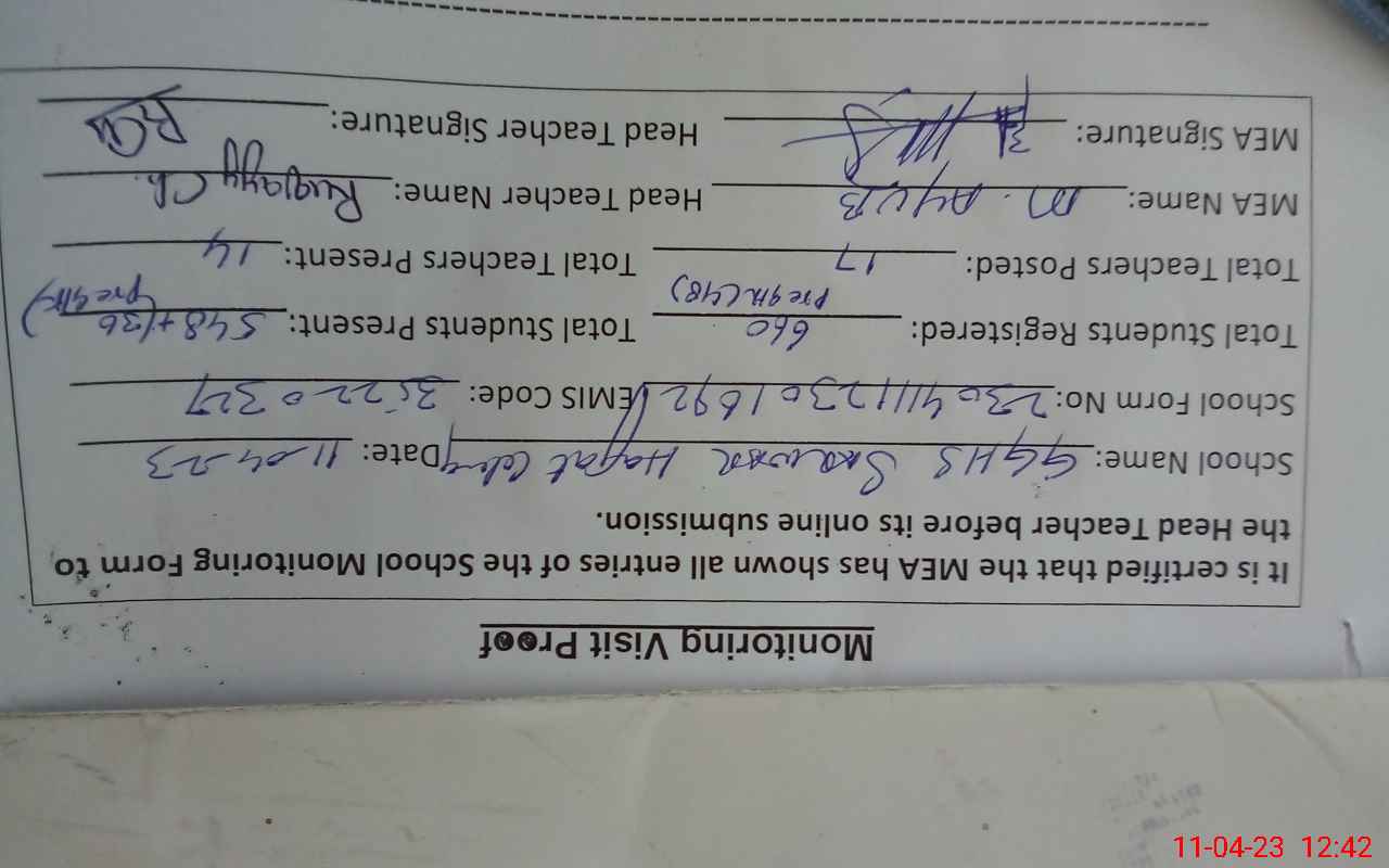 | Attendance Register | Head Teacher | MEA with School | Visit Proof |
