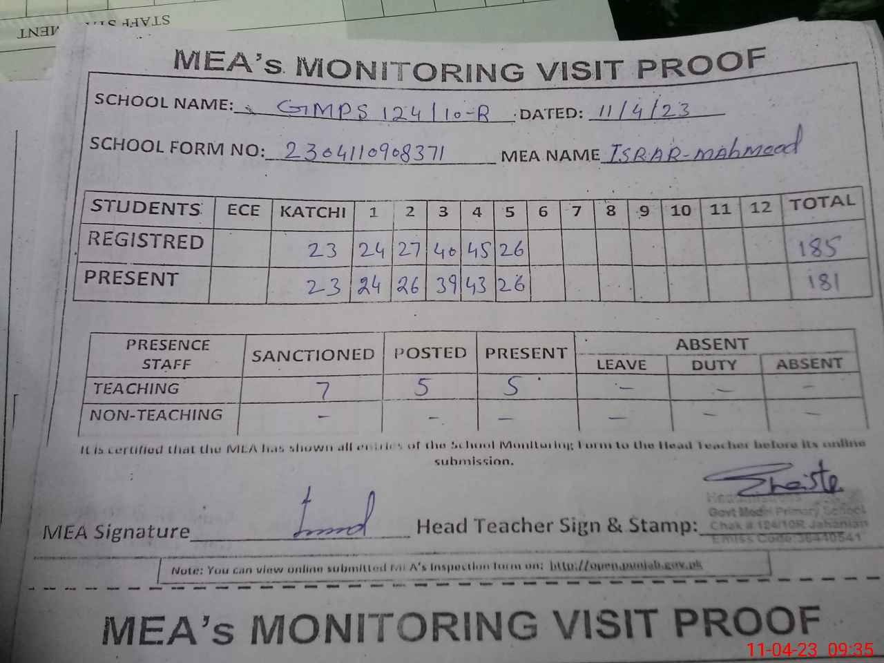 | Attendance Register | Head Teacher | MEA with School | Visit Proof |