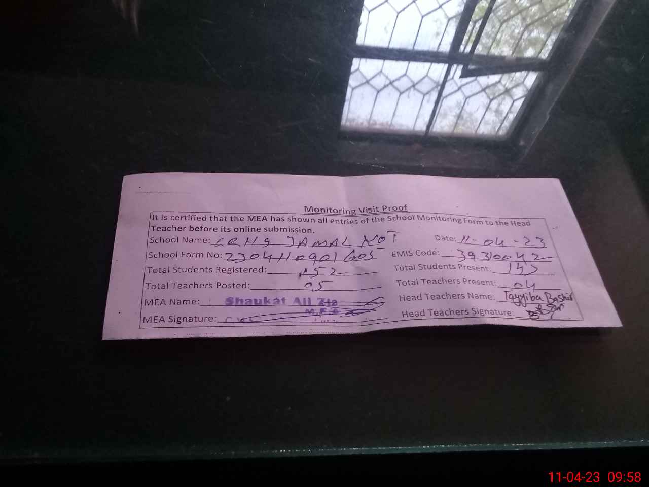 | Attendance Register | Head Teacher | MEA with School | Visit Proof |