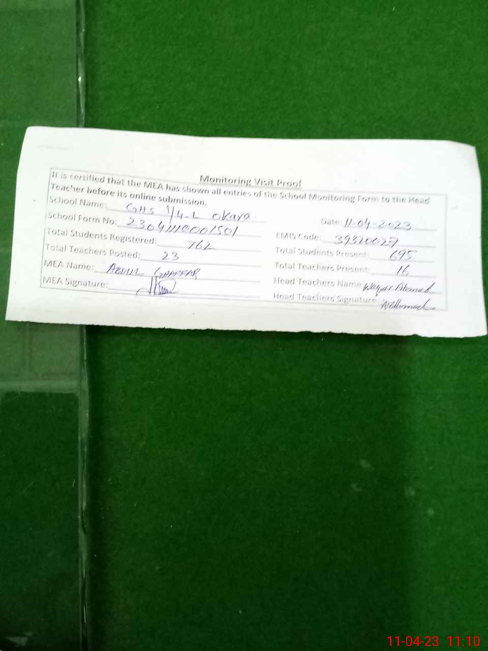 | Attendance Register | Head Teacher | MEA with School | Visit Proof |