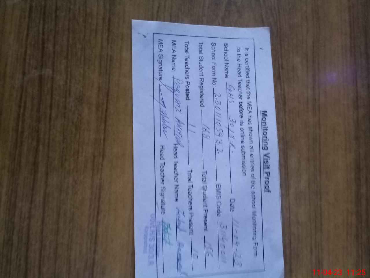 | Attendance Register | Head Teacher | MEA with School | Visit Proof |