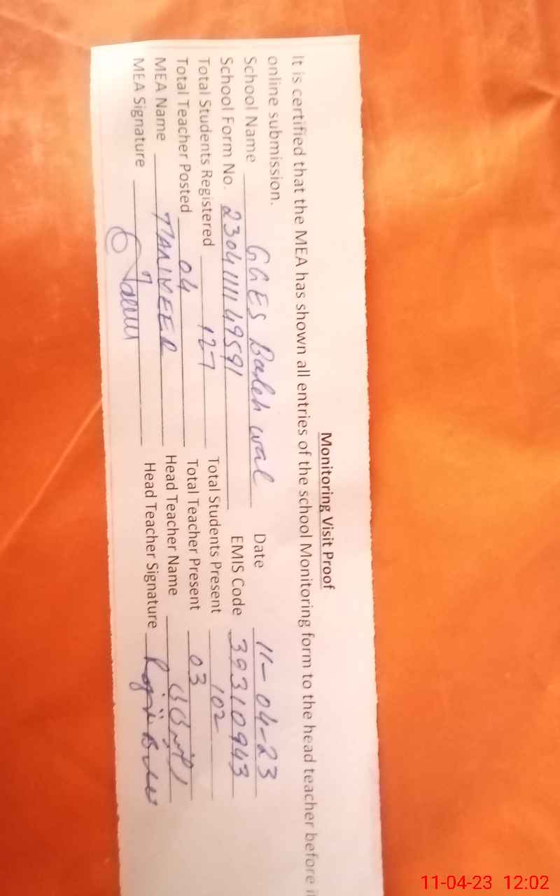| Attendance Register | Head Teacher | MEA with School | Visit Proof |