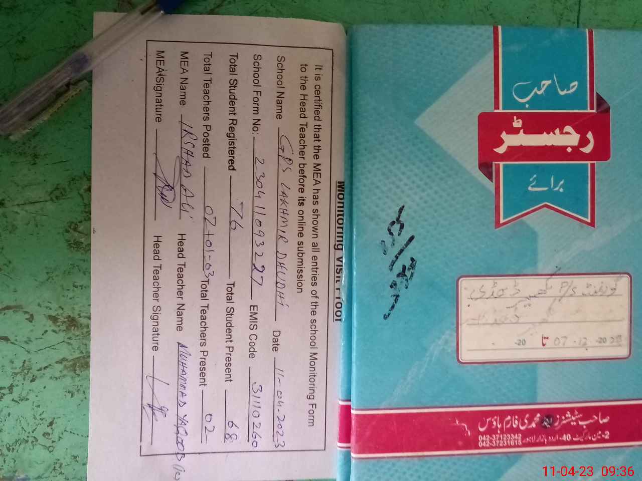 | Attendance Register | Head Teacher | MEA with School | Visit Proof |
