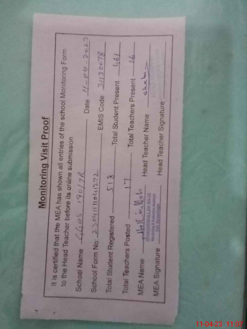 | EMIS Code: 31130078 | Name of School: GGHS CHAK NO 190/7-R | |||
