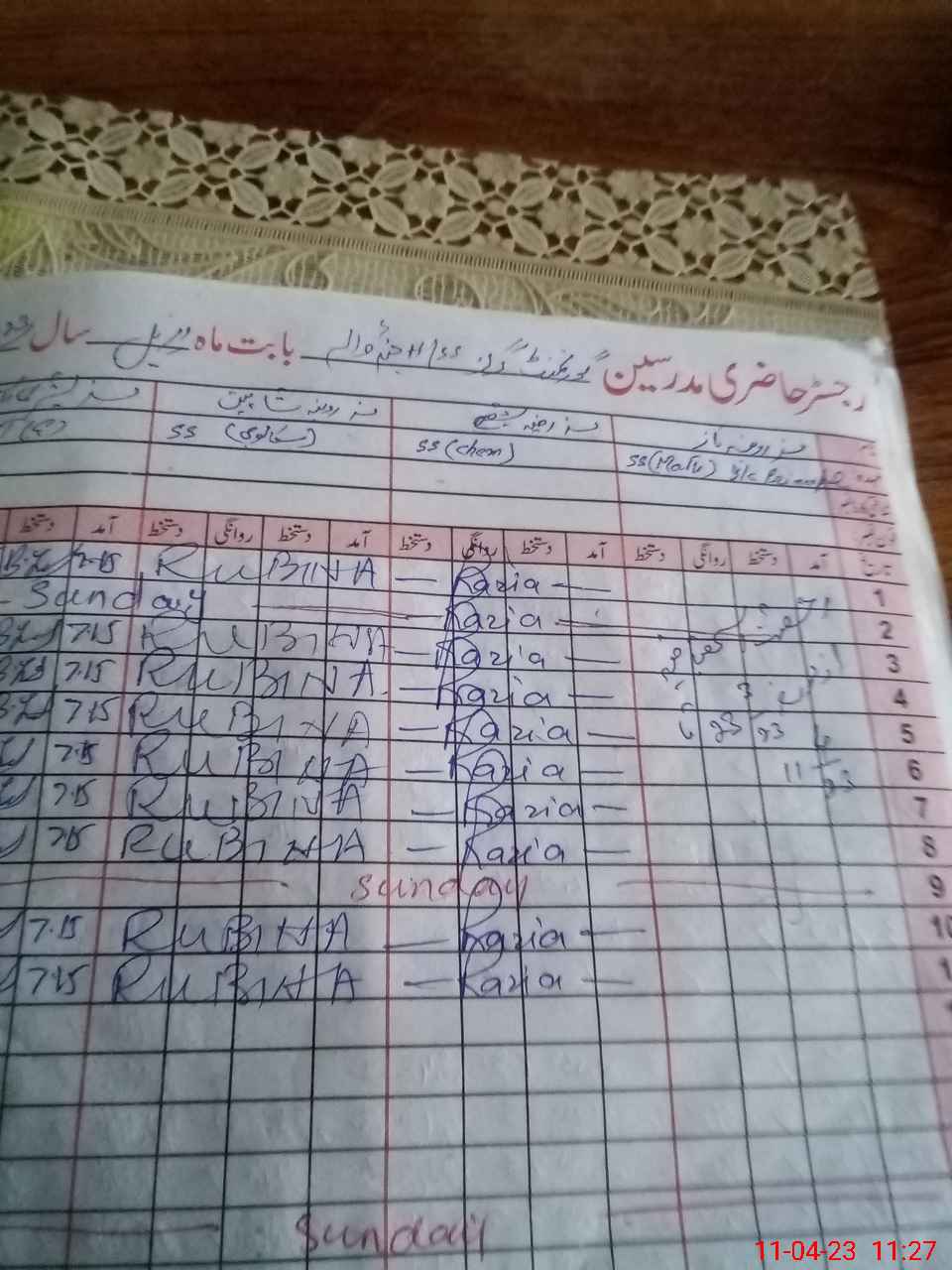 | CNIC | Full Name | Designation | R/C | Absence During Last Calender Month |