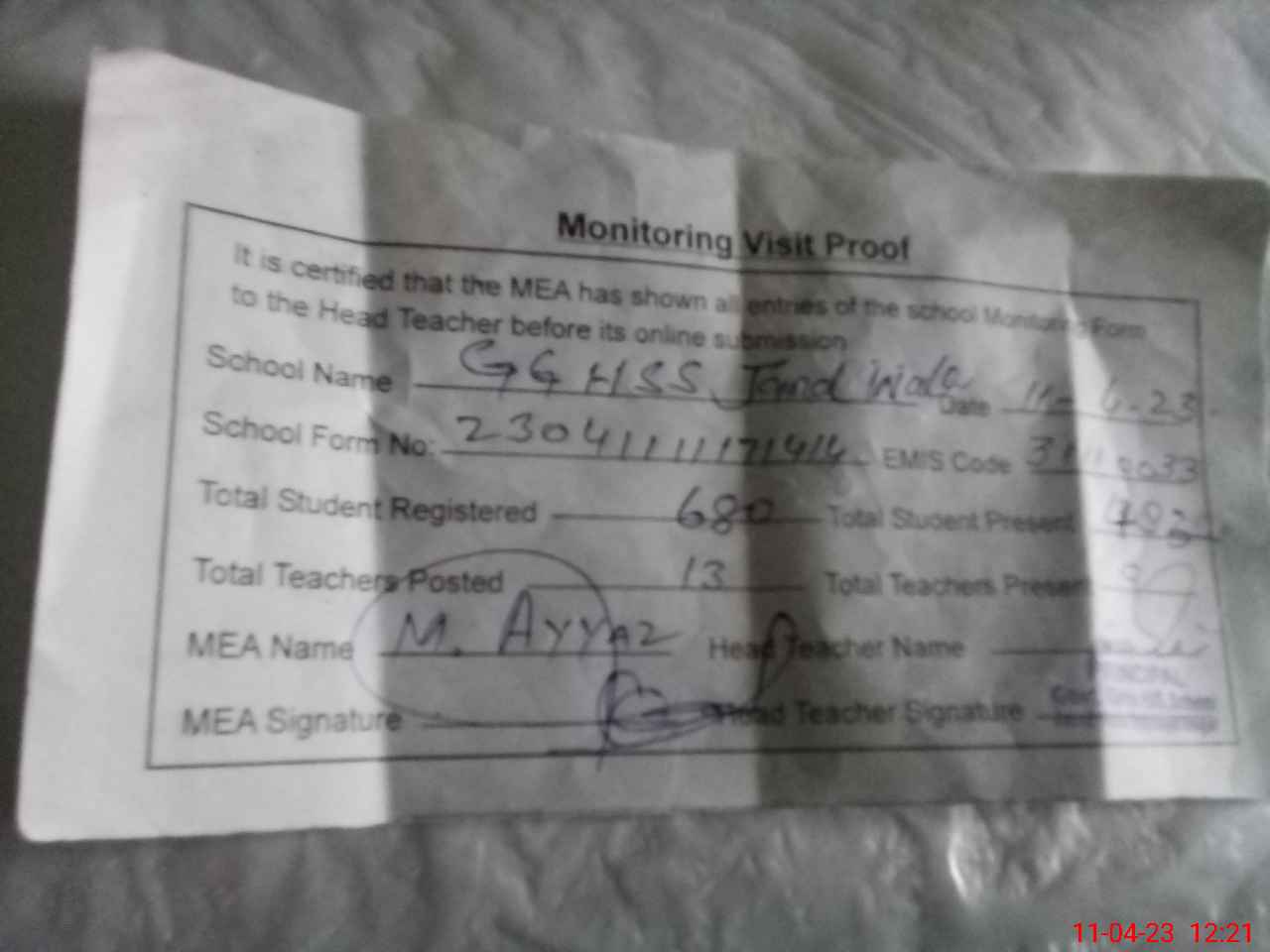 | Attendance Register | Head Teacher | MEA with School | Visit Proof |