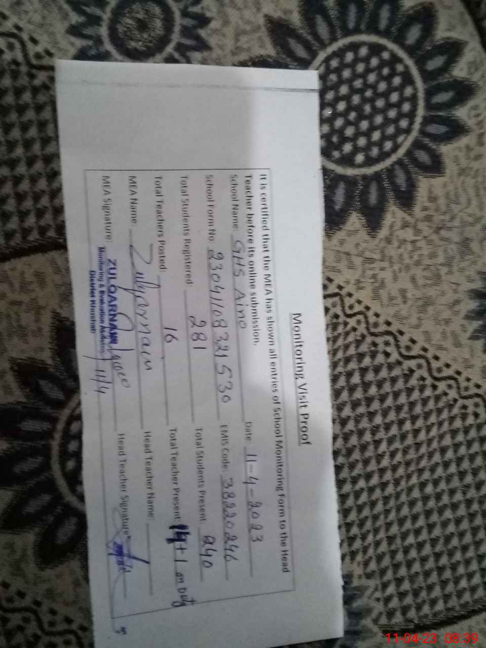 | Certified that this School was Inspected by the Undersigned MEA/DMO Today and the Information Stated Above is as Per Record. | |||||