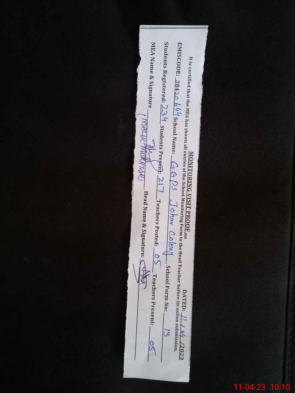 | Monitoring Date: 11-04-2023 | Start Time: 11-04-2023 09:18 AM | End Time: 11-04-2023 10:13 AM | Name of MEA: MU**** AH**** | |