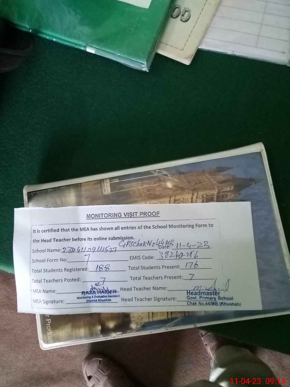| Attendance Register | Head Teacher | MEA with School | Visit Proof |