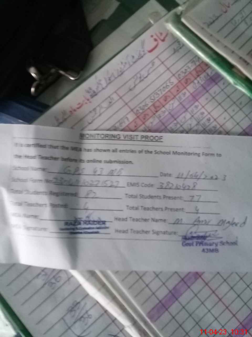 | Attendance Register | Head Teacher | MEA with School | Visit Proof |