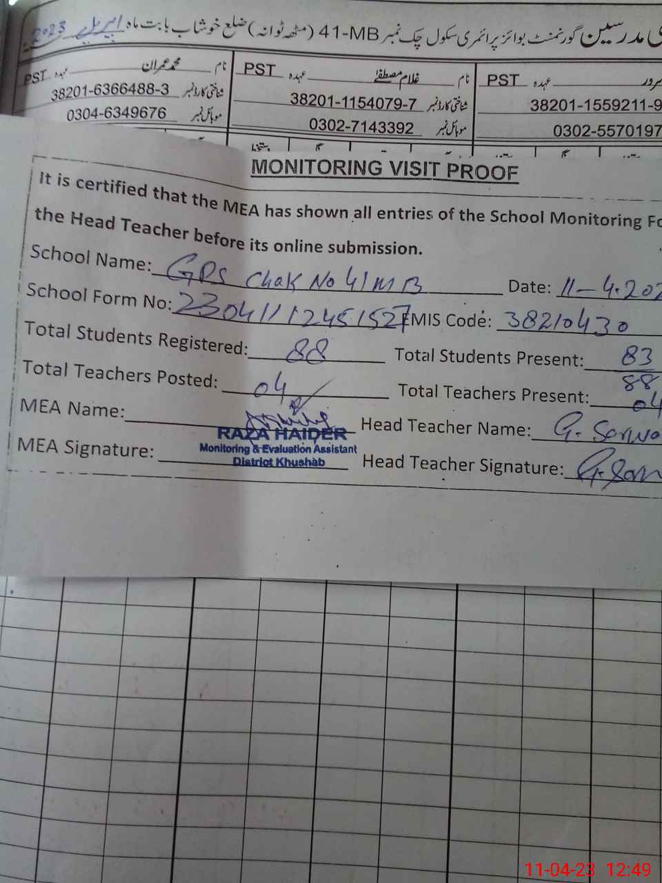 | Attendance Register | Head Teacher | MEA with School | Visit Proof |