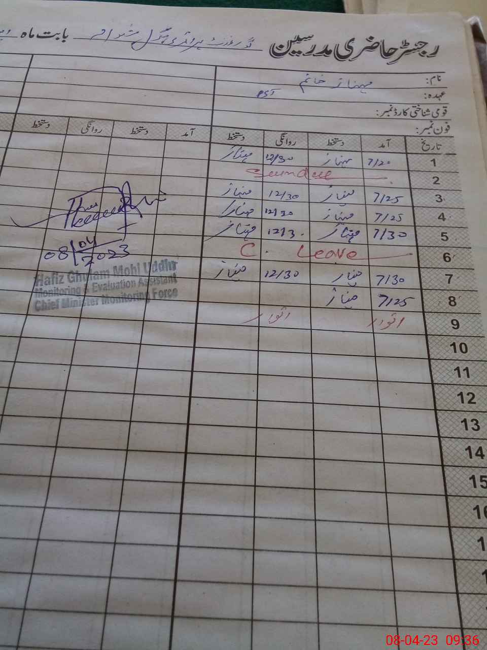 | CNIC | Full Name | Designation | R/C | Absence During Last Calender Month |
