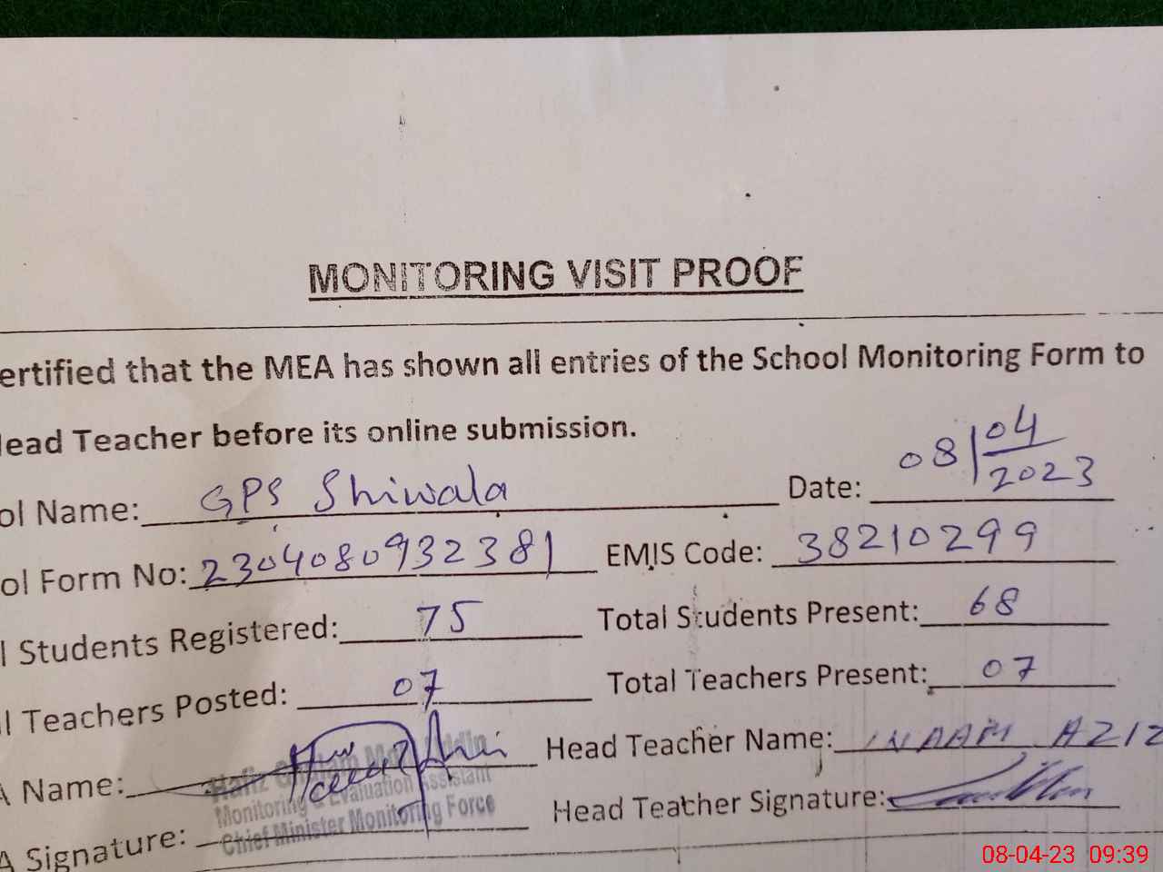 | Attendance Register | Head Teacher | MEA with School | Visit Proof |