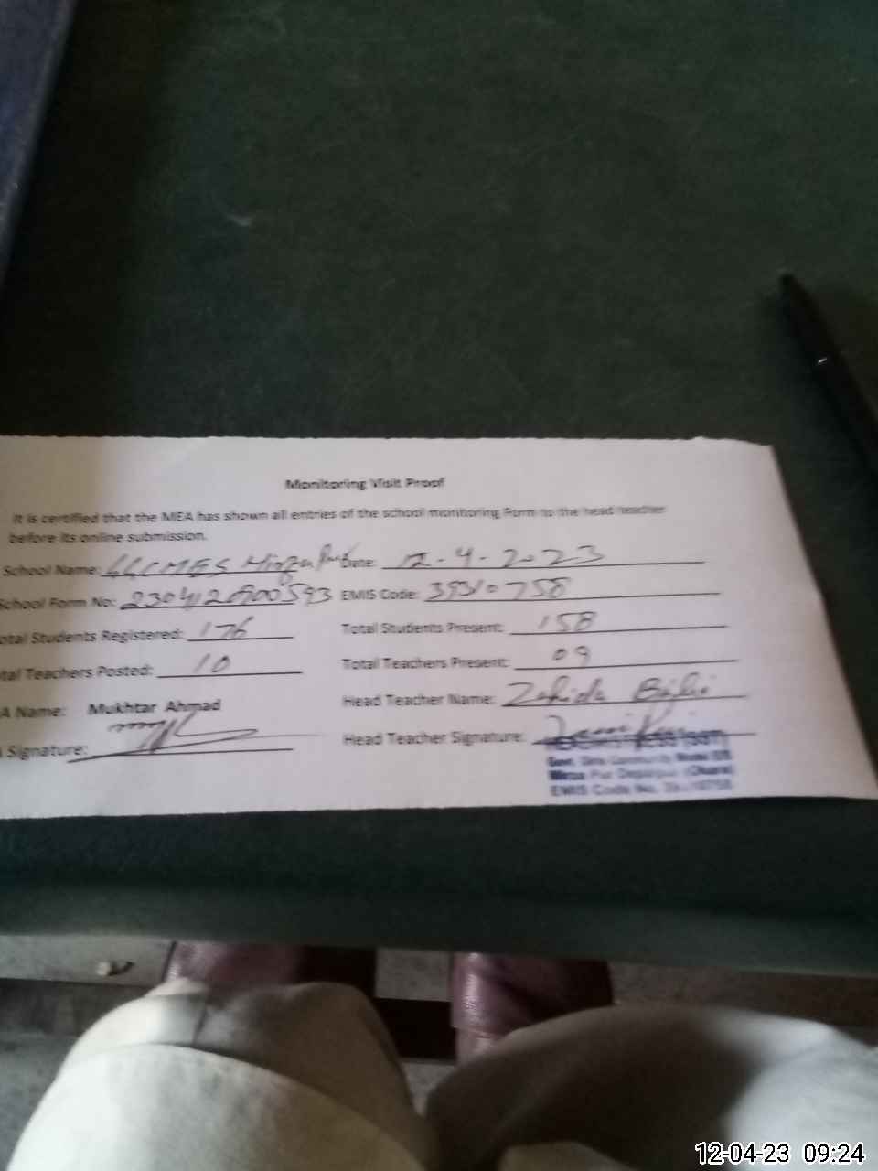 | Attendance Register | Head Teacher | MEA with School | Visit Proof |