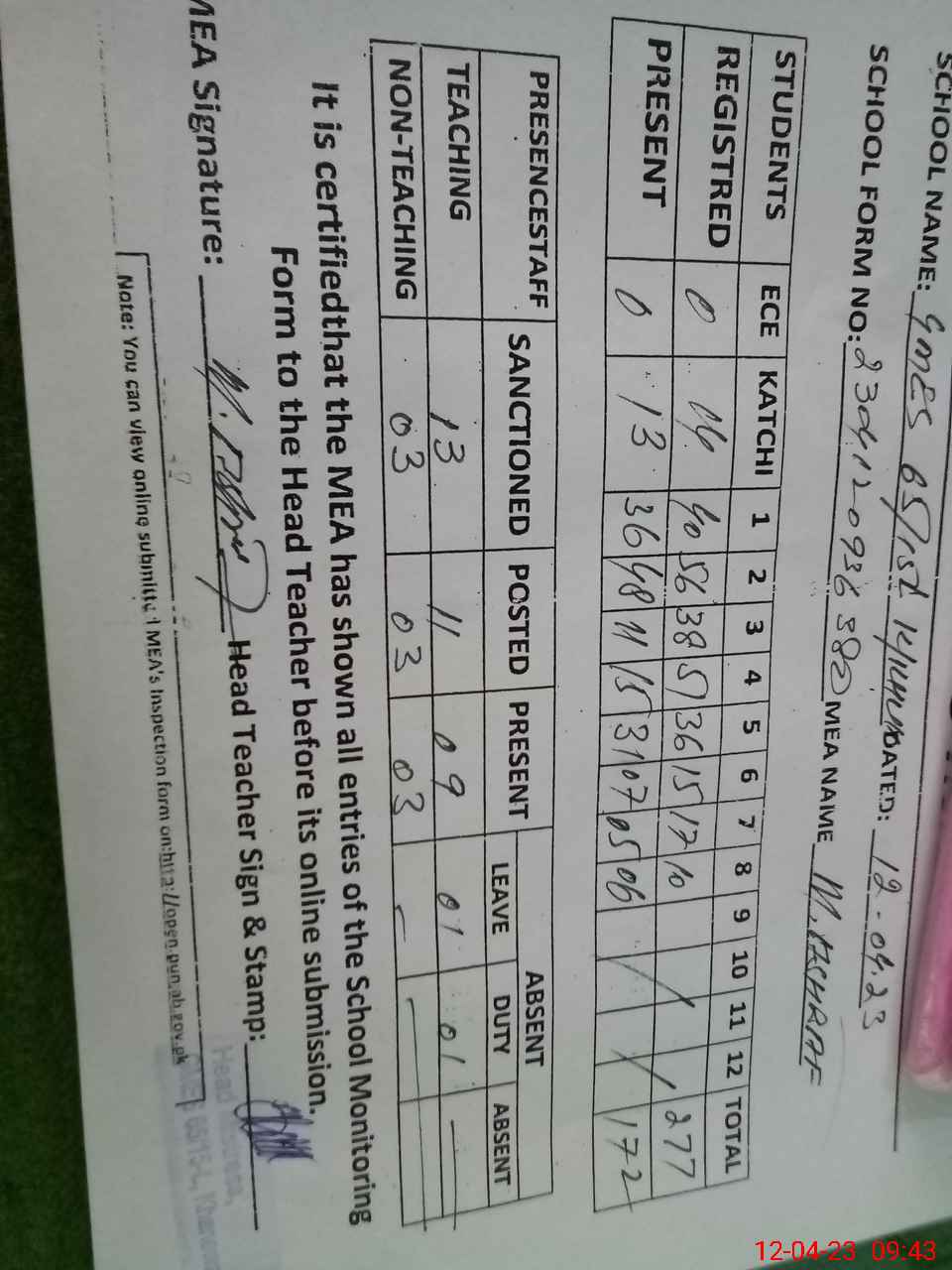 | Certified that this School was Inspected by the Undersigned MEA/DMO Today and the Information Stated Above is as Per Record. | |||||