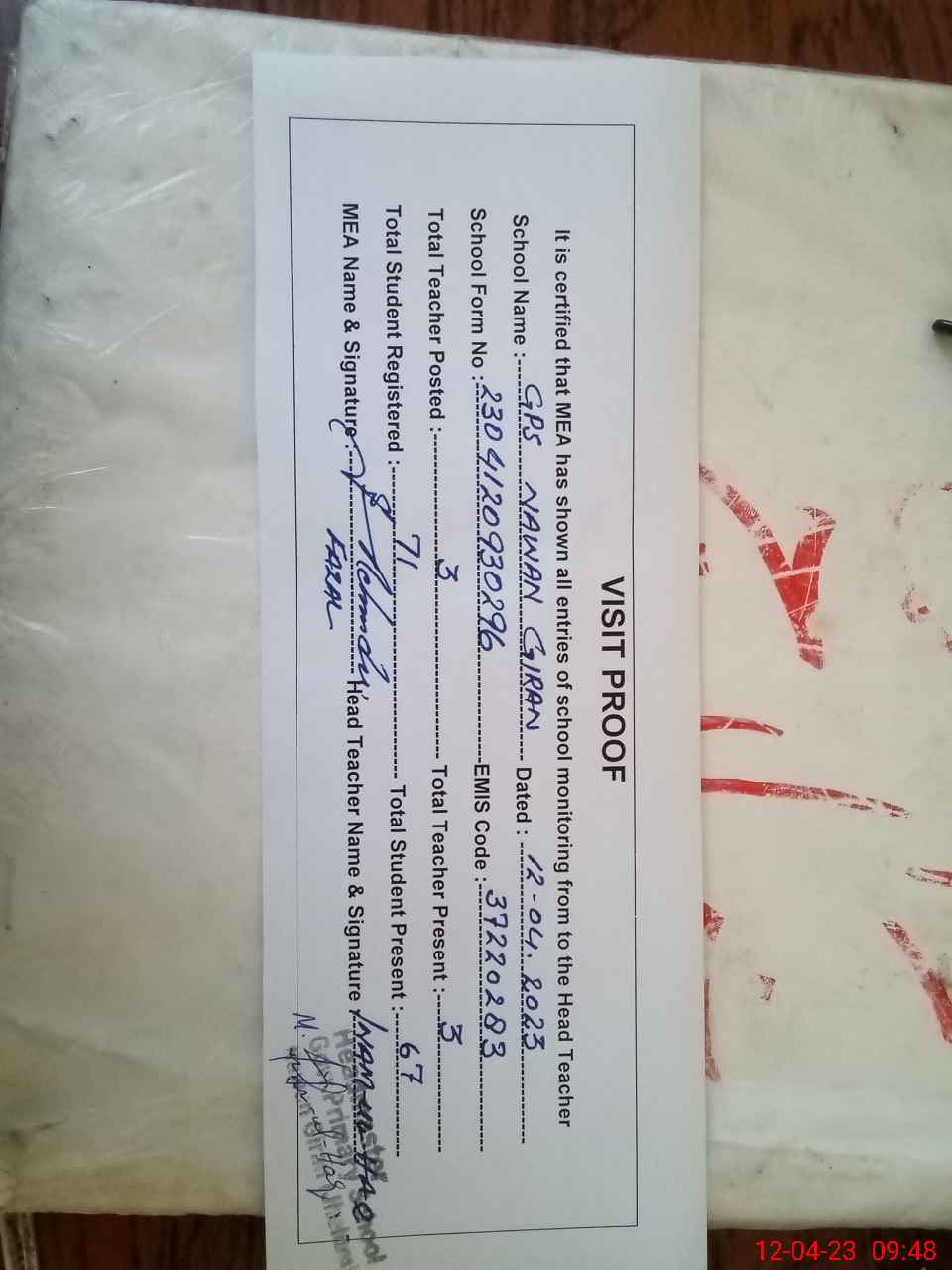 | Attendance Register | Head Teacher | MEA with School | Visit Proof |