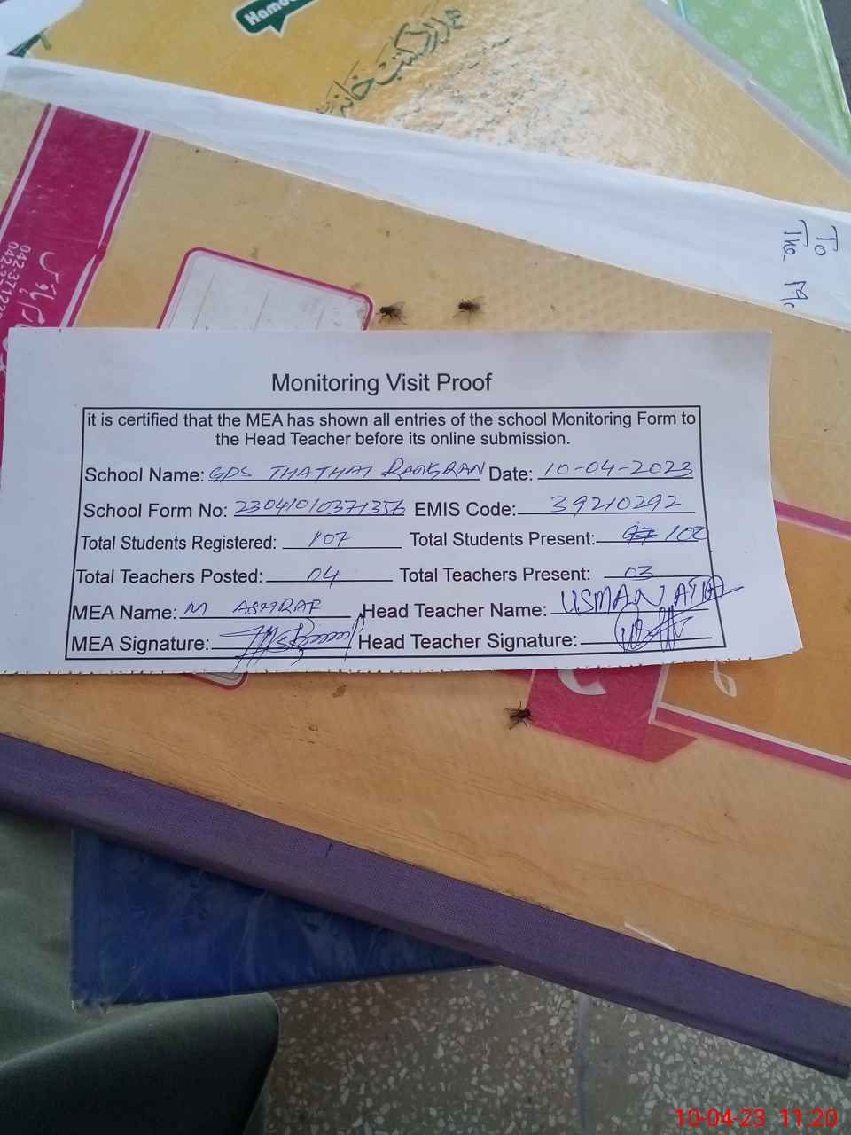 | Attendance Register | Head Teacher | MEA with School | Visit Proof |