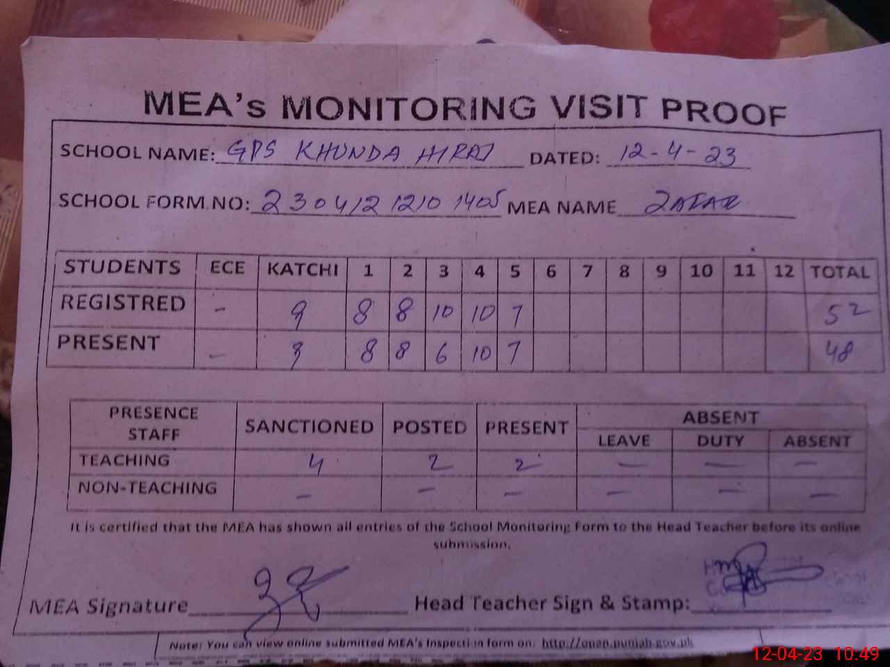 | Attendance Register | Head Teacher | MEA with School | Visit Proof |