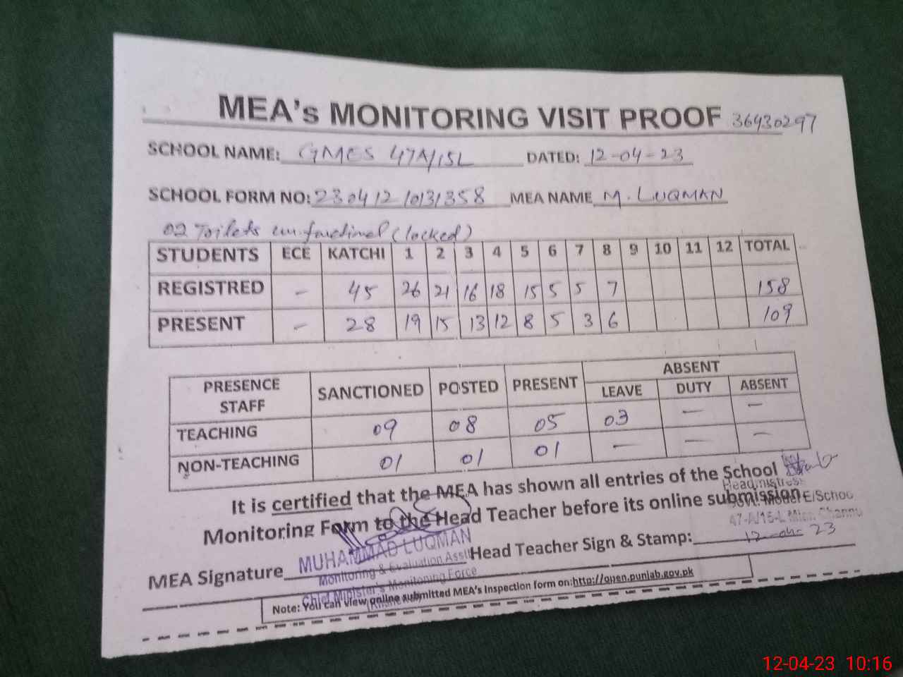 | Attendance Register | Head Teacher | MEA with School | Visit Proof |