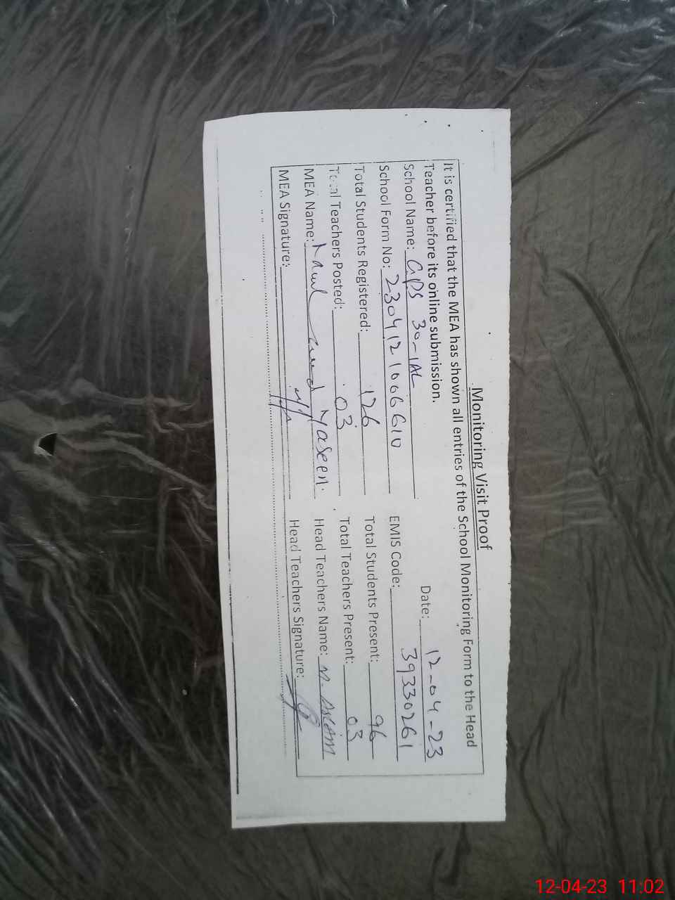 | Attendance Register | Head Teacher | MEA with School | Visit Proof |