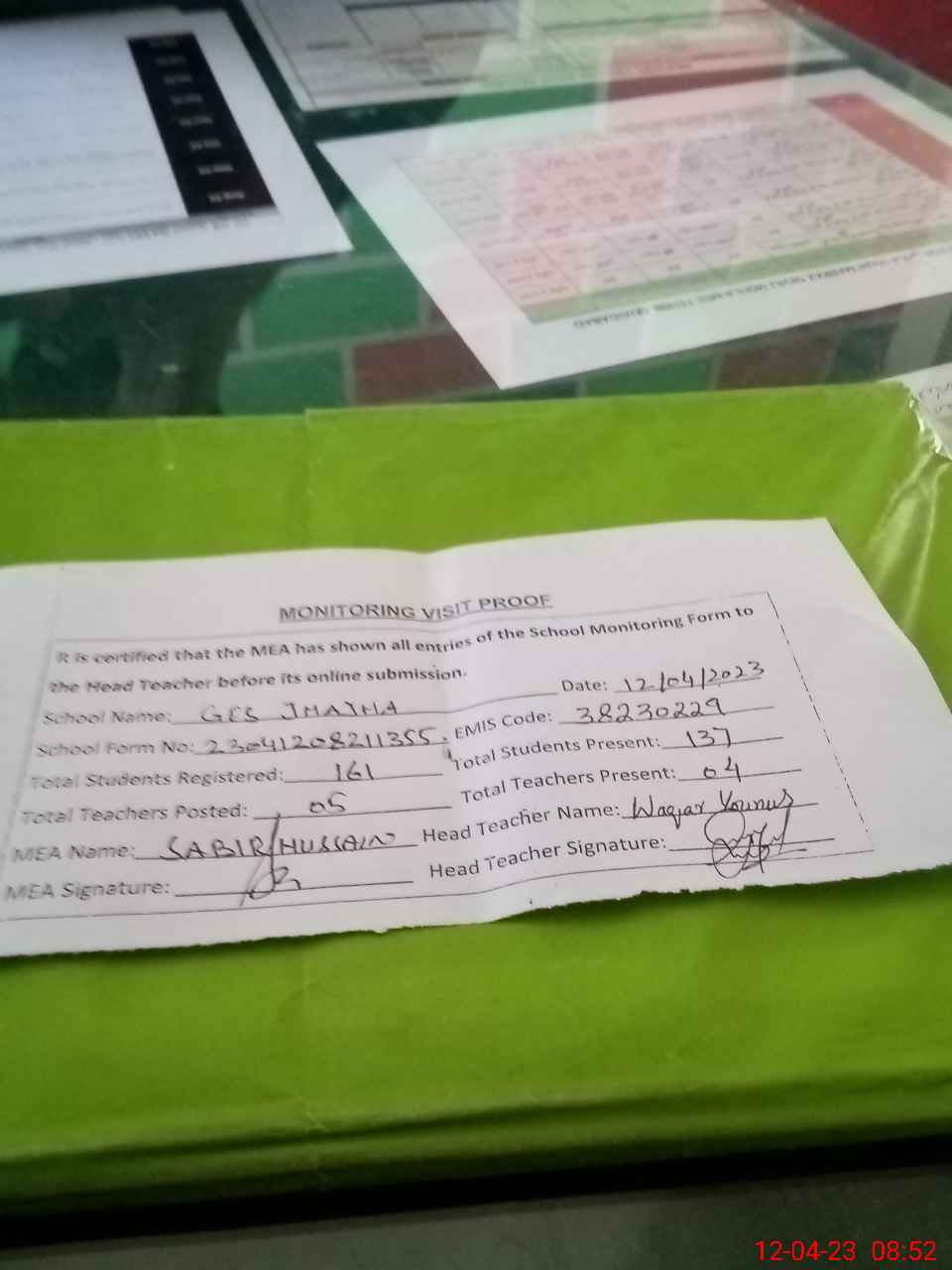 | Attendance Register | Head Teacher | MEA with School | Visit Proof |