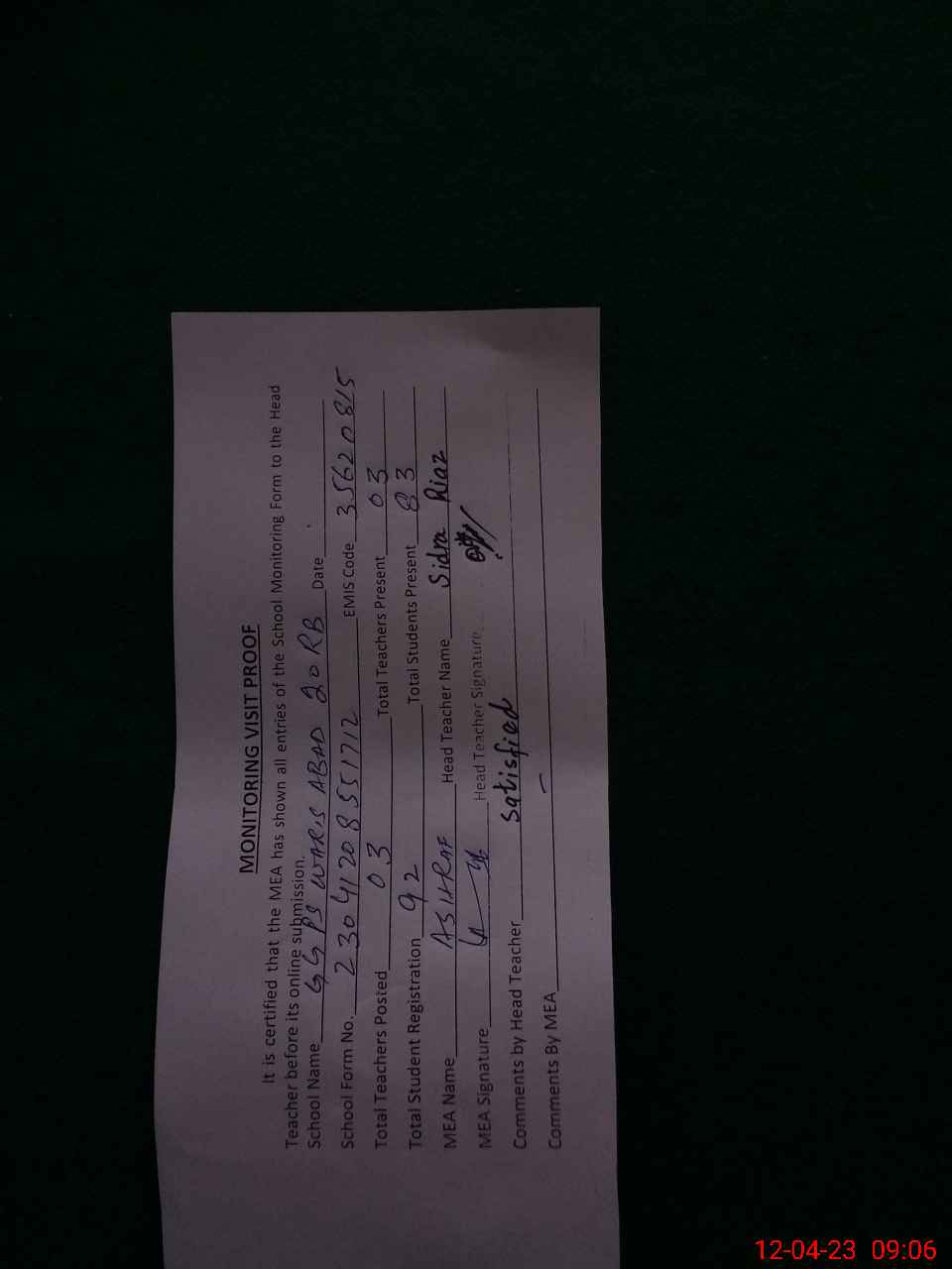 | Attendance Register | Head Teacher | MEA with School | Visit Proof |