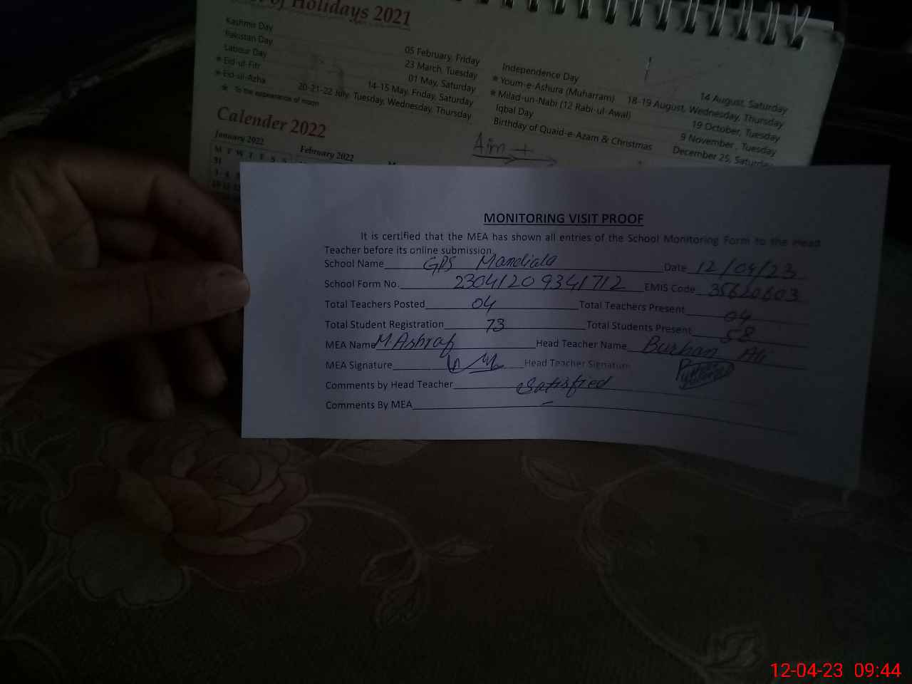 | Attendance Register | Head Teacher | MEA with School | Visit Proof |
