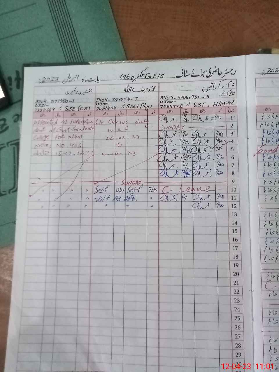 | CNIC | Full Name | Designation | R/C | Absence During Last Calender Month |