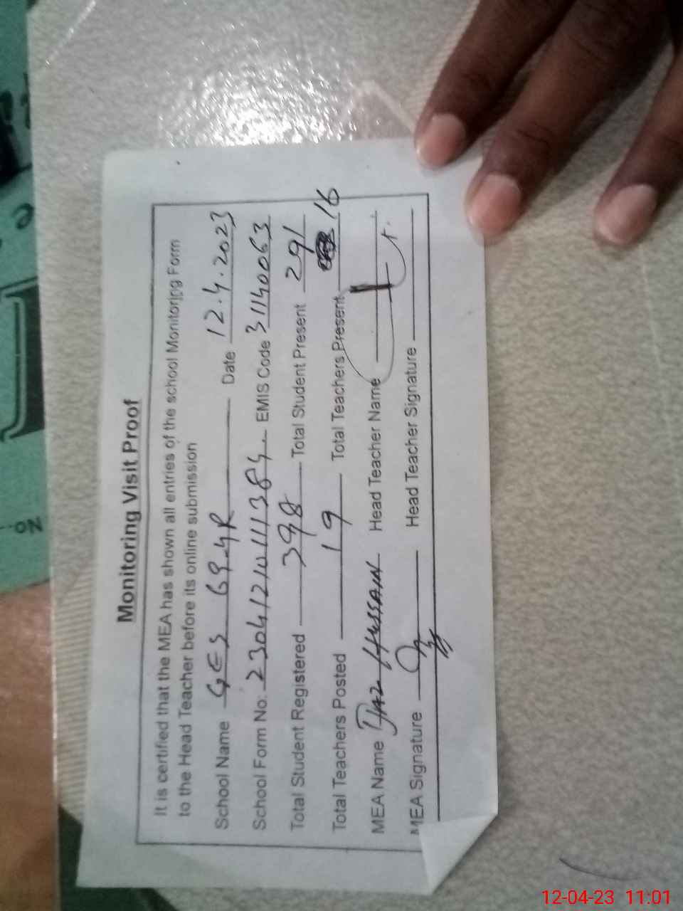 | Attendance Register | Head Teacher | MEA with School | Visit Proof |