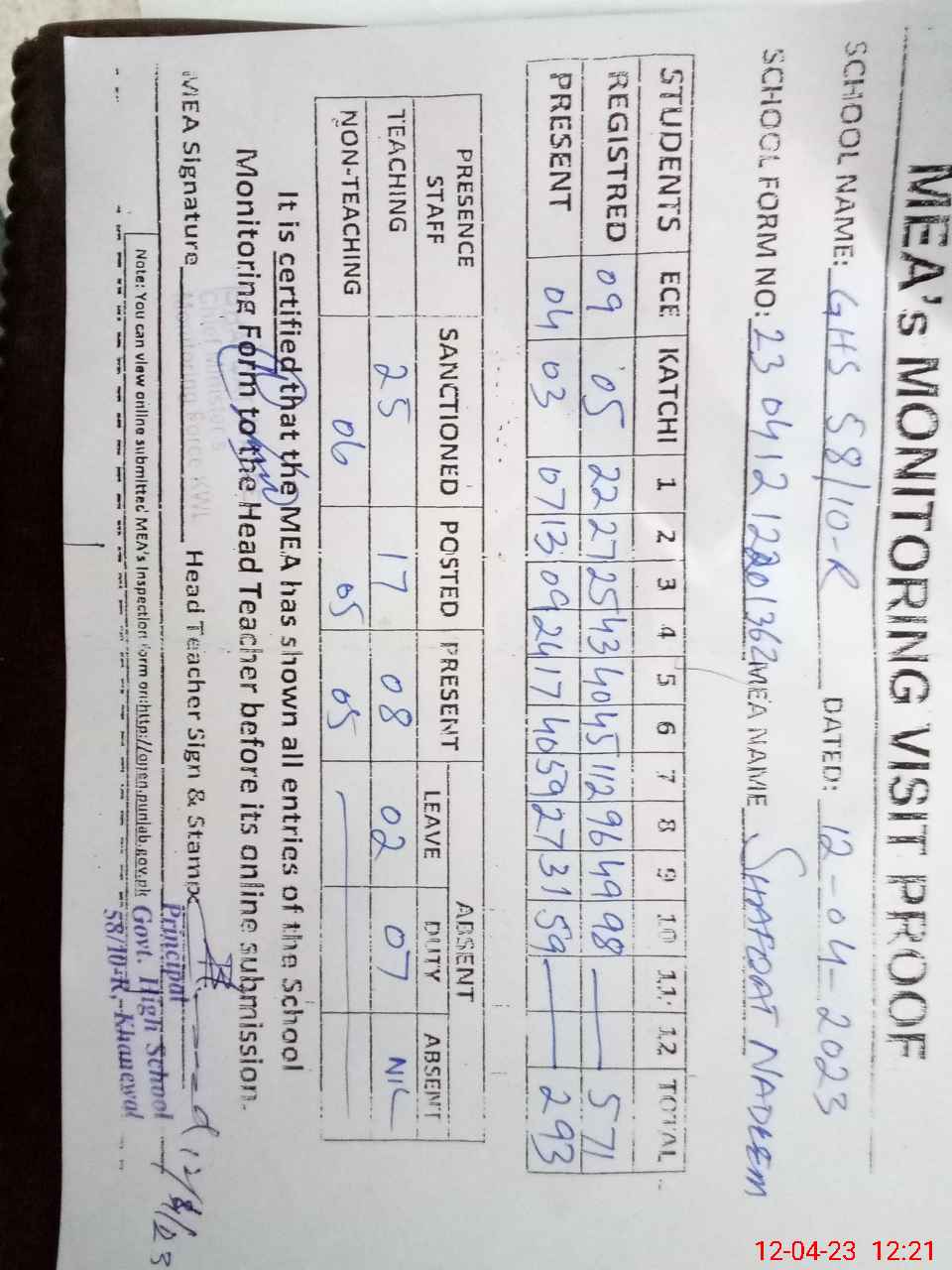 | EMIS Code: 36420071 | Name of School: GHS 58/10-R, KHANEWAL | |||
