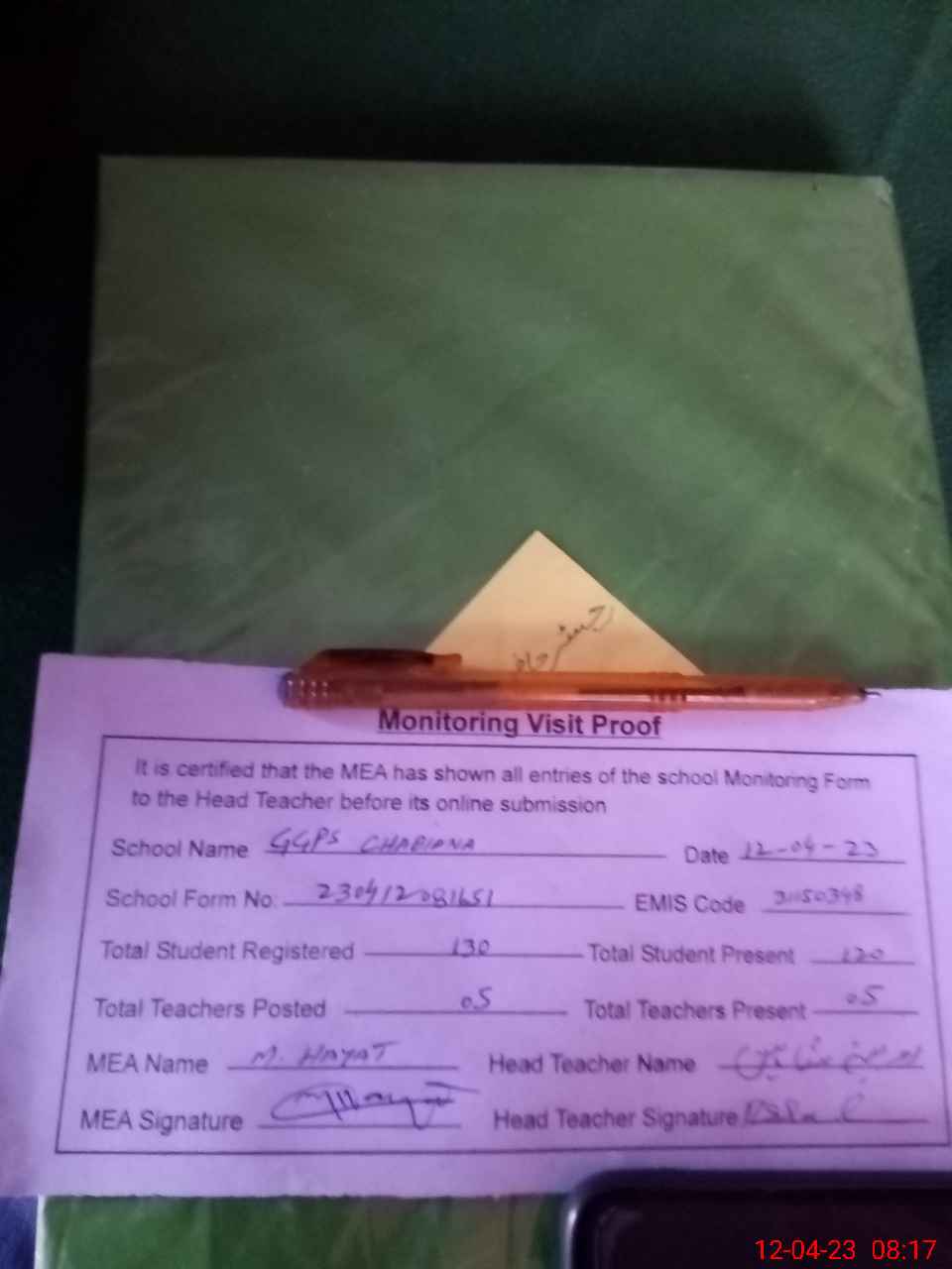 | Attendance Register | Head Teacher | MEA with School | Visit Proof |
