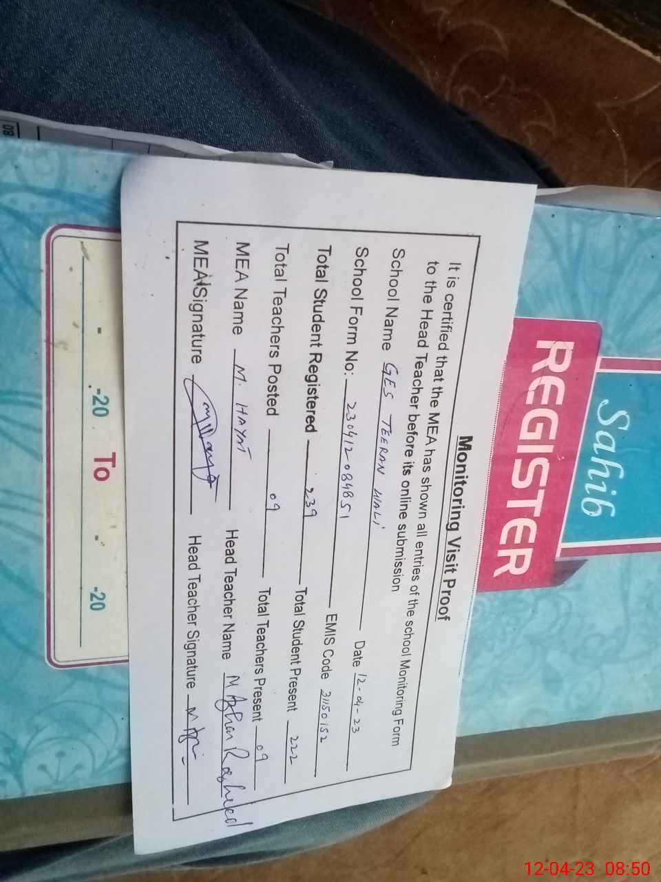 | Attendance Register | Head Teacher | MEA with School | Visit Proof |