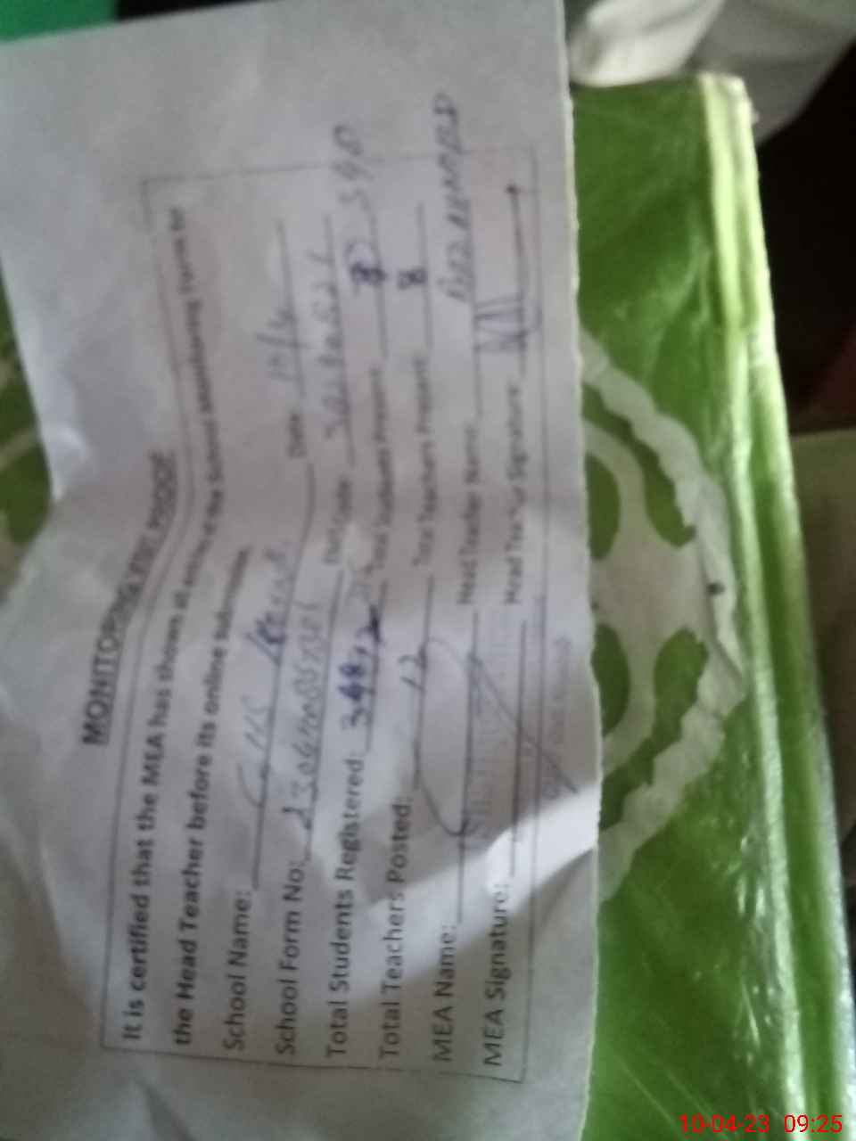 | Attendance Register | Head Teacher | MEA with School | Visit Proof |